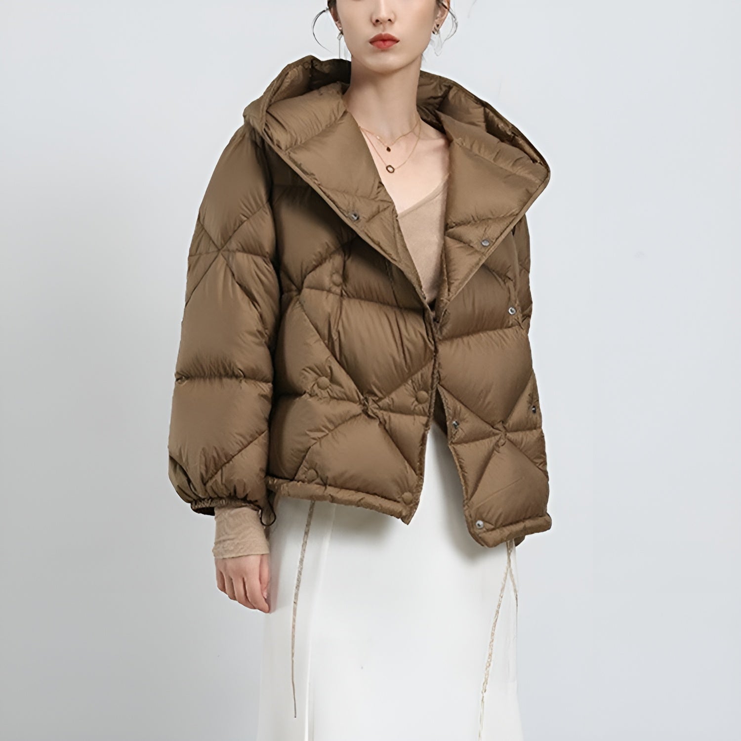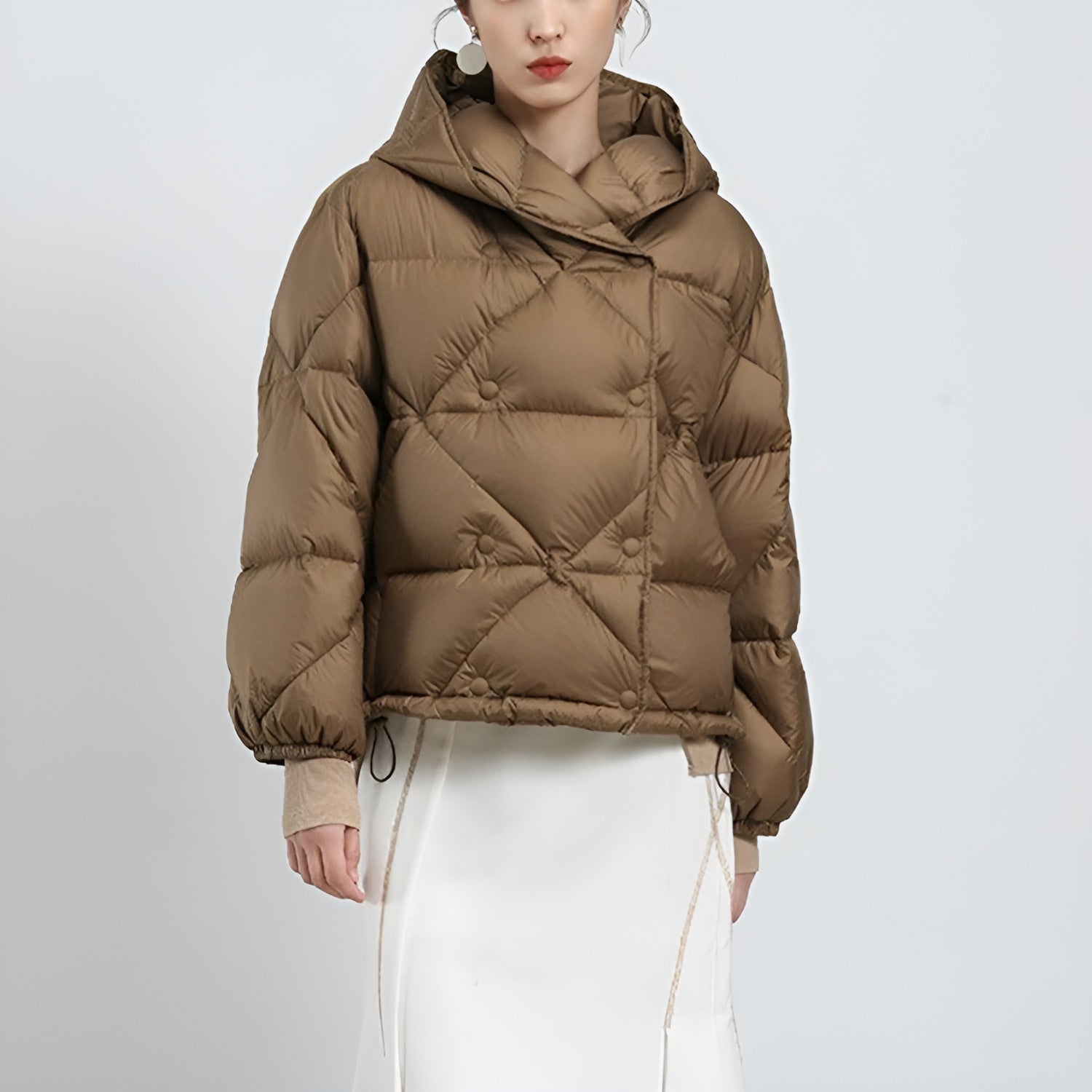 ミラナ ダブルブレスト パファージャケットは、最大の断熱性と精緻な仕立てを兼ね備えた、クラシックな冬ウェアの現代的な解釈です。目を引く重なり合ったシルエットと高級なダックダウン充填を備え、このコートはボリュームを抑えつつ、スリークで構造的な見た目を維持します。中立的なカラーパレットでデザインされており、どんなアウトフィットにも簡単に合わせることができ、寒い季節のワードローブに欠かせないアイテムです。